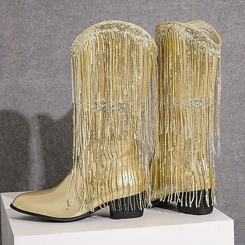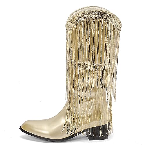 Specificaties: LIPIJIXI Rand Metallic Cowboy Laarzen voor dames Ronde Neus Kwast Bling Knee Hoge Laarzen