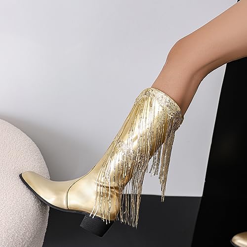 LIPIJIXI Rand Metallic Cowboy Laarzen voor dames Ronde Neus Kwast Bling Knee Hoge Laarzen