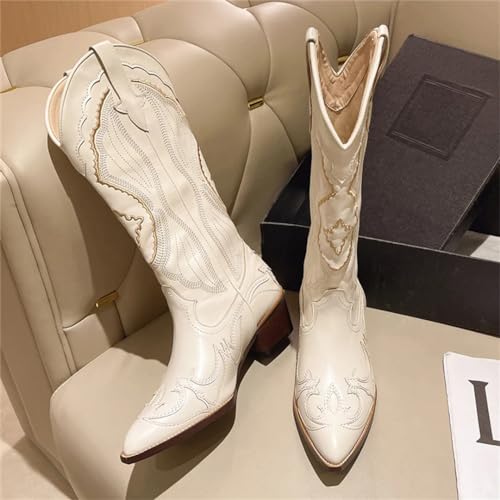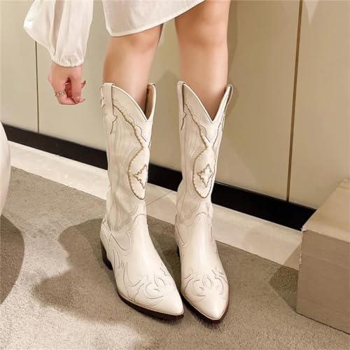 Schoenen: Dameslaarzen met spitse neus en halfhoge kuit/witte westerse cowboylaarzen voor dames