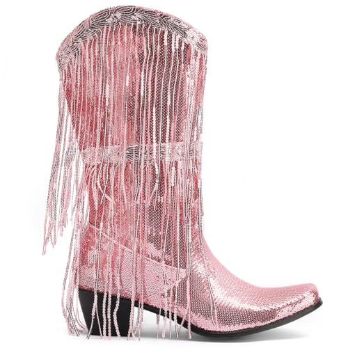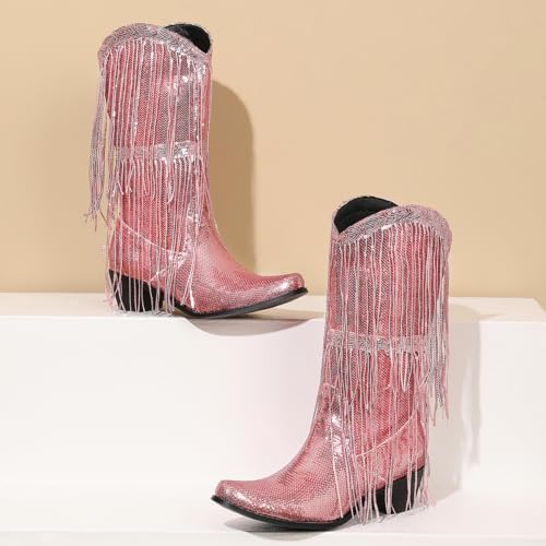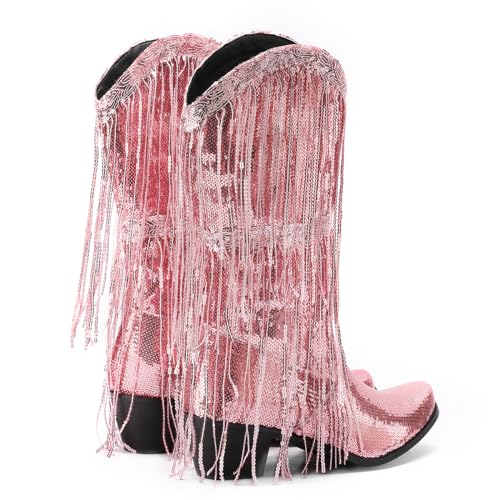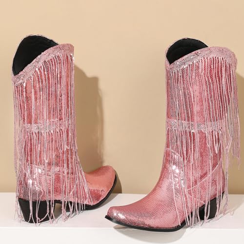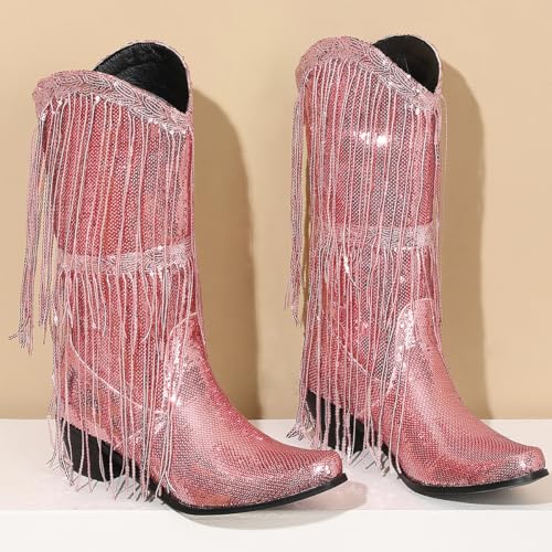 Makmeoyw Glittery Rand Cowboy Laarzen Sparkly Kwast CowgirL Laarzen Clubwear Bling Mid Calf Western Laarzen