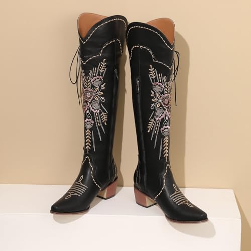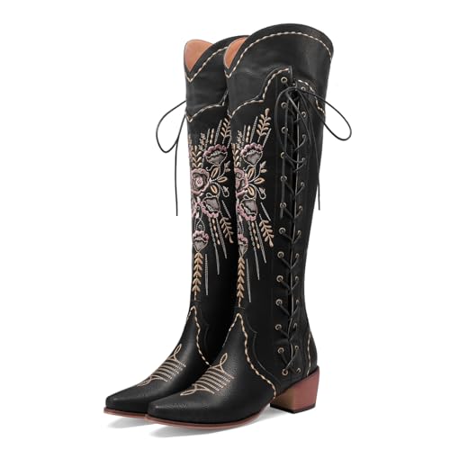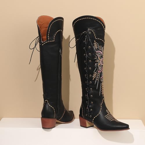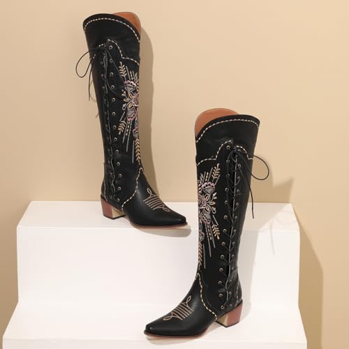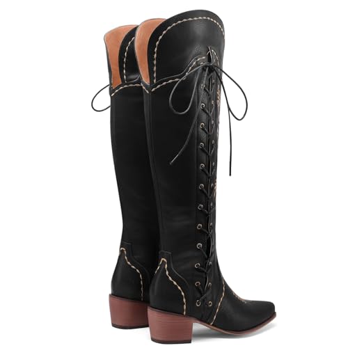 PAUVAODY Klassiek CowgirL Laarzen voor dames Chunky Heel Western Knee Hoge Laarzen Pull On Wide Calf Cowboy Laarzen