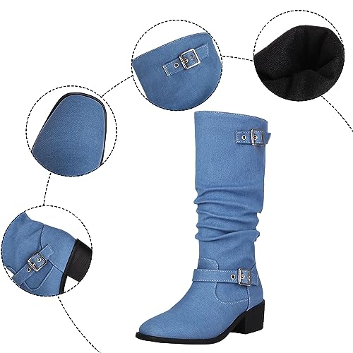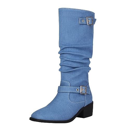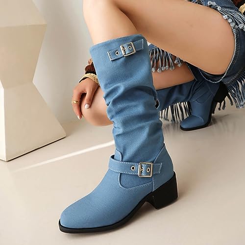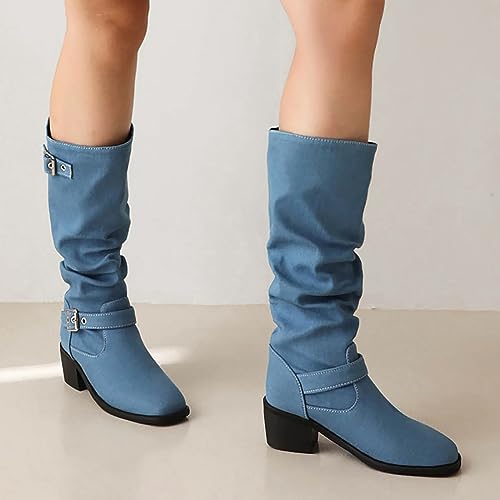 Tkukkwr Schoenen Laarzen Voor Vrouwen Buitenlandse Handel Herfst En Winter Vrouwen Laarzen Cowboy Doek Grove Hak Lage Hak Riem Gesp Hoge Laarzen Cowboy Laarzen voor Vrouwen